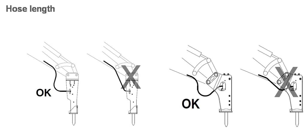တပ်ဆင်မည့် ဟိုက်ဒရောလစ် ဘရိကာ၏ ရိုက်ချက် ပြည့်မီရန် ၎င်းအတွက် လိုအပ်သော (တစ်မိနစ်အတွင်း) ဟိုက်ဒရောလစ်ဆီ စီးနှုံးသည် အဆိုပါဘရိကာ တပ်ဆင်မည့် မြေတူးစက်၏ မိန်းပန့်မှ တွန်းထုတ်နိုင်သော (တစ်မိနစ်အတွင်း) ဟိုက်ဒရောလစ်ဆီ စီးနှုံးထက် (Liters per minute ထက်) လျော့နည်းရမည်။ {Rated attachment oil flow ≤ 100% of Main pump discharge flow}